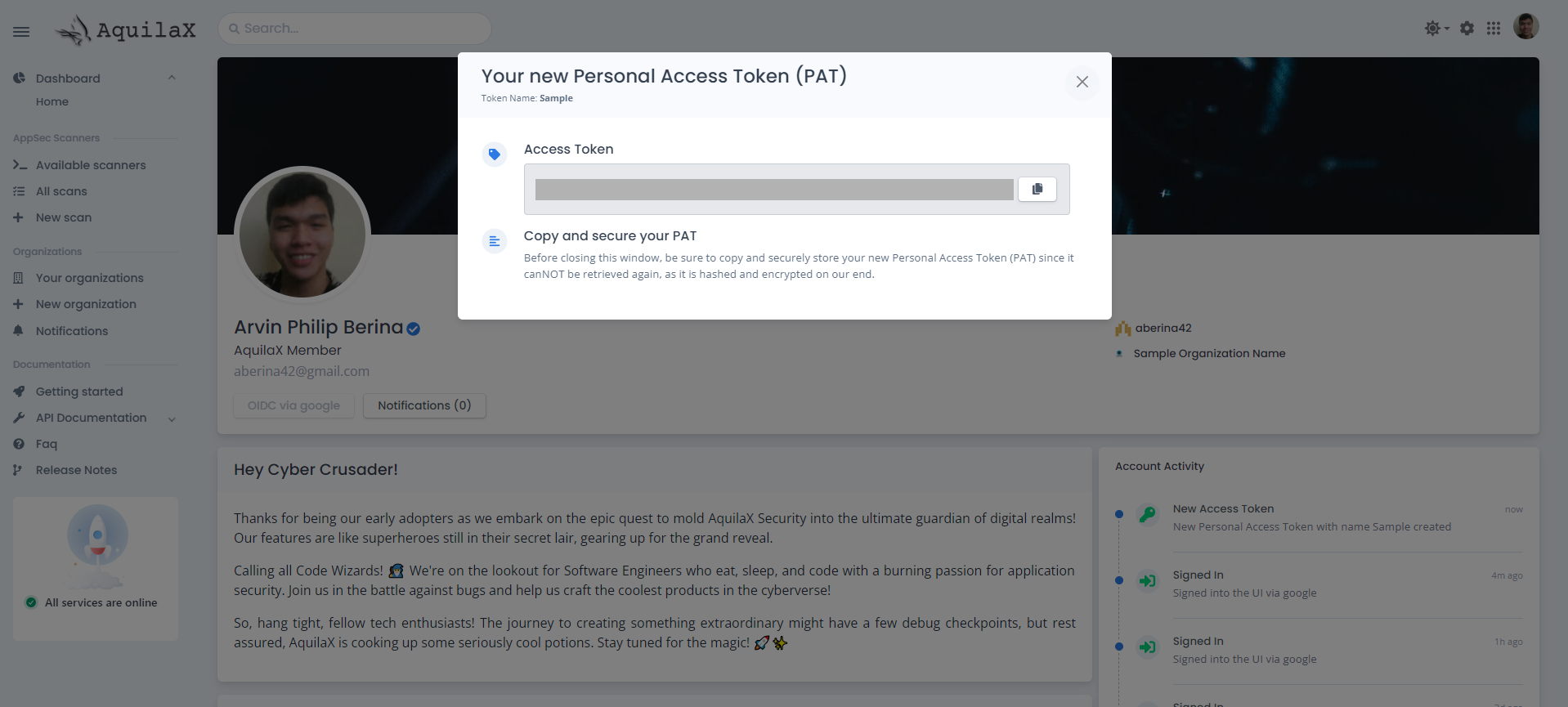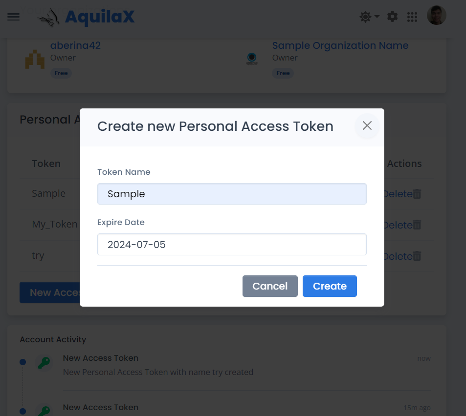 Navigate to <https://app.aquilax.ai/profile>, then in the `Personal Access Tokens (PAT)` you just create a new token.